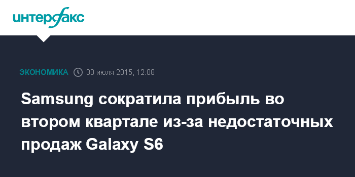 Москва. 30 июля. INTERFAX.RU – Южнокорейская Samsung Electronics, крупнейший мировой производитель смартфонов, сократила чистую прибыль во втором квартале 2015 года на 8%, поскольку продажи флагманского смартфона компании - Galaxy S6 - не оправдали ожиданий.