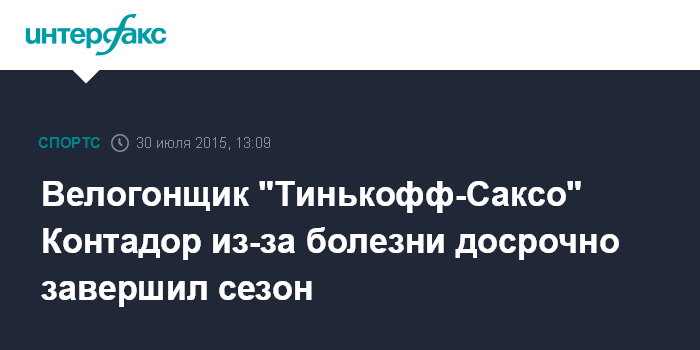"К сожалению, болезнь поставила крест на амбициях лидера российской команды "Тинькофф-Саксо" Альберто Контадора победно завершить сезон-2015 и выиграть у себя на родине "Классику Сан-Себастьяна", которая состоится 1 августа", - говорится в пресс-релизе "Тинькофф-Саксо".