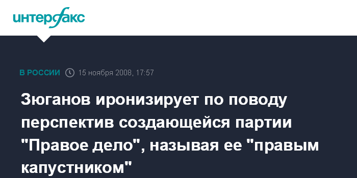 "Партия под названием "Правое дело", это, я бы сказал, правый капустник, слепленный из огрызков трех партий", - сказал Зюганов "Интерфаксу", комментируя принятое в субботу решение о роспуске СПС, ДПР и "Гражданской силы" и перспективу создания на их базе новой правой партии.