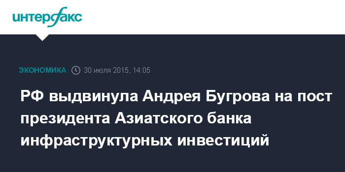 Москва. 30 июля. INTERFAX.RU – Россия номинировала на пост президента Азиатского банка инфраструктурных инвестиций (АБИИ) Андрея Бугрова, говорится в сообщении Минфина.