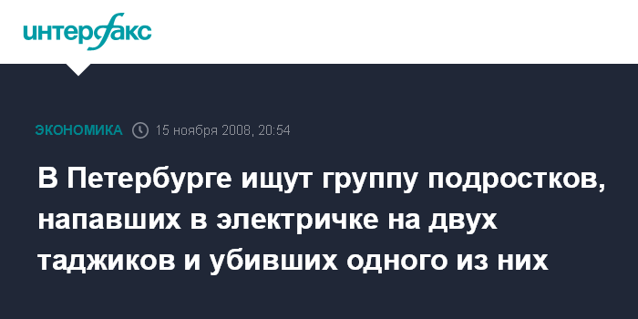 "Около 15 человек - молодые люди и девушки, сев в электричку на Финляндском вокзале, в одном из вагонов напали на двух уроженцев Таджикистана. Они избили их, а одного ранили ножом, в результате чего пострадавший от полученных ран скончался", - сказал собеседник агентства.