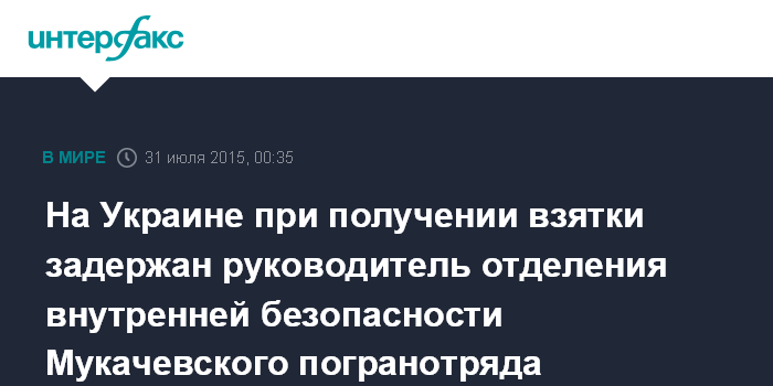 Москва. 31 июля. INTERFAX.RU - Руководитель отделения внутренней безопасности Мукачевского пограничного отряда Государственной пограничной службы задержан в связи с получением неправомерной выгоды в размере 15 тыс. гривен, сообщается на сайте заместителя генпрокурора Украины - главного военного прокурора Анатолия Матиоса.