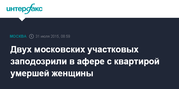 Москва. 31 июля. INTERFAX.RU - Двое участковых в столице попали под подозрение в мошенничестве с квартирой, хозяйка которой умерла, сообщили "Интерфаксу" в пресс-службе ГУ МВД России по Москве.