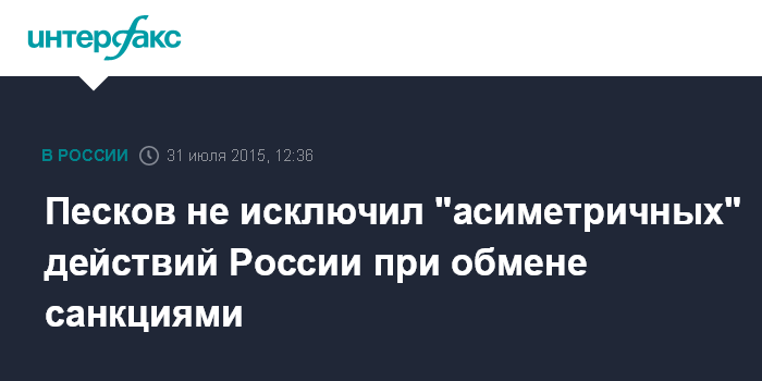 Москва. 31 июля. INTERFAX.RU - Россия будет исходить из принципов взаимности в отношении стран, вводящих против нее санкции, однако не исключает и асимметричного ответа, заявил в пятницу пресс-секретарь президента России Дмитрий Песков.