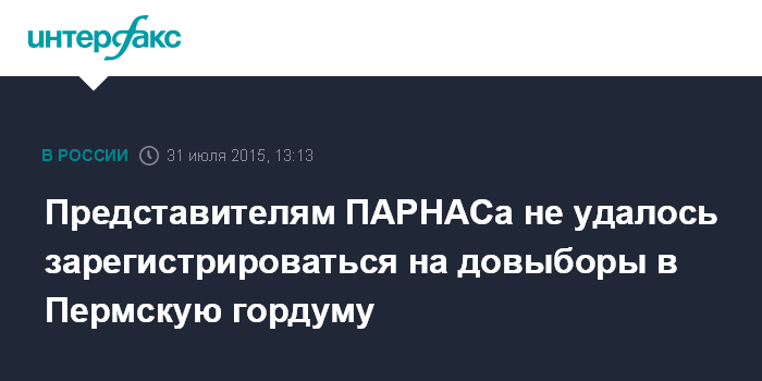 Москва. 31 июля. INTERFAX.RU - Избирательная комиссия не зарегистрировала кандидатов от партии ПАРНАС на выборы по округу N32 в гордуму Перми из-за выявленных нарушений при подаче заявления, сообщили "Интерфаксу" в избиркоме региона.