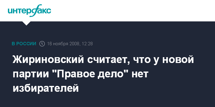 Москва. 16 ноября. INTERFAX.RU - Лидер ЛДПР, вице-спикер Госдумы Владимир Жириновский полагает, что у новой партии "Правое Дело" нет своей политической ниши - ее сегодня занимает "Единая Россия".