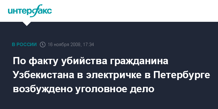 Санкт-Петербург. 16 ноября. INTERFAX.RU - Северо-Западное следственное управление на транспорте при Генпрокуратуре РФ возбудило уголовное дело по факту гибели в электричке в Петербурге в субботу вечером гражданина Узбекистана.