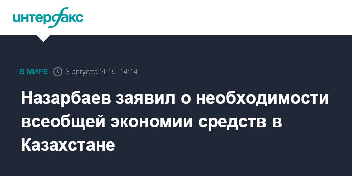 Москва. 3 августа. INTERFAX.RU - Президент Казахстана Нурсултан Назарбаев заявил о необходимости всеобщей экономии средств в стране на фоне ухудшения внешнеэкономической конъюнктуры и, как следствие, снижения доходов бюджета.