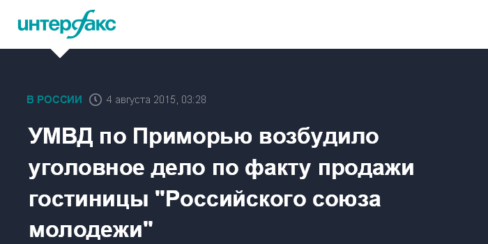 Москва. 4 августа. INTERFAX.RU - Уголовное дело возбуждено после выявленных прокуратурой нарушений при продаже расположенного во Владивостоке гостиничного комплекса, принадлежавшего "Российскому союзу молодежи".