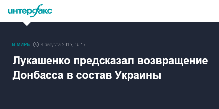 Москва. 4 августа. INTERFAX.RU - Президент Белоруссии Александр Лукашенко выразил уверенность, что Донбасс останется в составе Украины, несмотря на вооруженный конфликт в регионе.