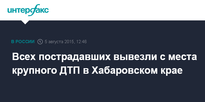 Москва. 5 августа. INTERFAX.RU - Все пострадавшие вывезены с места столкновения двух пассажирских автобусов в Хабаровском крае, сообщила замминистра здравоохранения Хабаровского края Ирина Баглай.