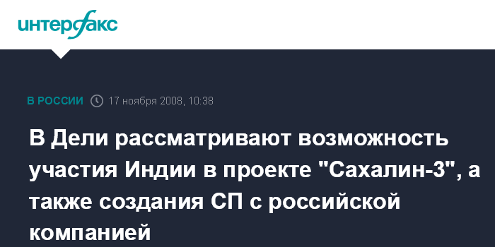 Москва. 17 ноября. INTERFAX.RU - Индия заинтересована в участии в проекте "Сахалин-3", а также в создании СП с одной из российских компаний, заявил индийский посол в РФ Прабхат Пракаш Шукла.