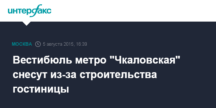 Москва. 5 августа. INTERFAX.RU - В связи со строительством в Москве гостиницы возле Курского вокзала на Земляном валу снесут наземную часть вестибюля станции "Чкаловская" Люблинско-Дмитровской линии метрополитена, сообщили "Интерфаксу" в городской администрации.