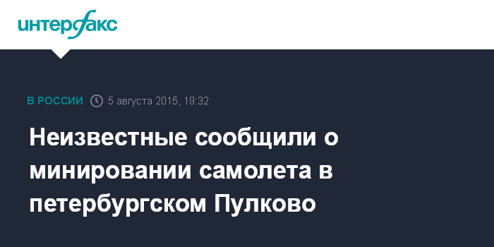 Москва. 5 августа. INTERFAX.RU - Сотрудники транспортной полиции Петербурга проверяют сообщение о минировании самолета в "Пулково", аэропорт работает в штатном режиме, сообщили "Интерфаксу" в пресс-службе ООО "Воздушные ворота северной столицы" (ВВСС, управляет аэропортом "Пулково") в среду.