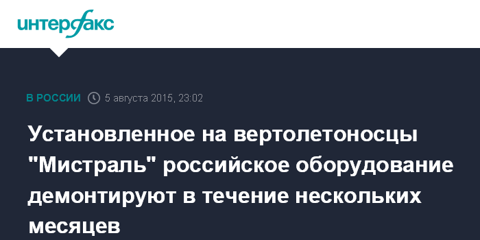 Москва. 5 августа. INTERFAX.RU - Российские предприятия, чье оборудование было установлено на вертолетоносцы "Мистраль", готовы решить задачу по его демонтажу в кратчайшие сроки - в течение одного двух месяцев, сообщил "Интерфаксу" в среду источник в оборонно-промышленном комплексе.