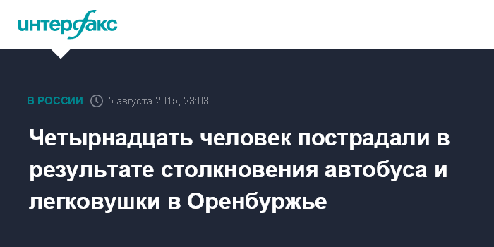 Москва. 5 августа. INTERFAX.RU - Столкновение автобуса и легкового автомобиля произошло в Шарлыкском районе Оренбургской области, пострадали более 10 человек.