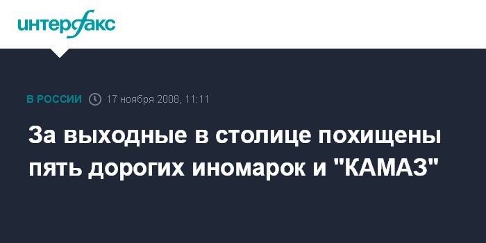 Москва. 17 ноября. INTERFAX.RU - За прошедшие выходные в столице было похищено пять дорогих иномарок и "КАМАЗ" на общую сумму около 19 млн рублей, сообщил "Интерфаксу" источник в правоохранительных органах города в понедельник.