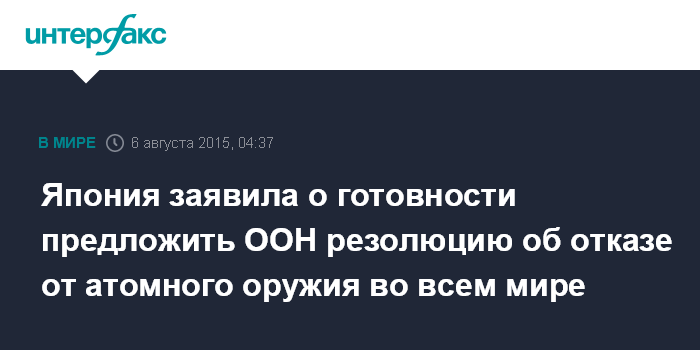 Москва. 6 августа. INTERFAX.RU - Япония готовит резолюцию о полном отказе в мире от ядерного оружия, которую намерена выдвинуть на рассмотрение Генеральной ассамблее ООН, заявил японский премьер-министр Синдзо Абэ.