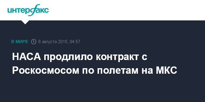 Москва. 6 августа. INTERFAX.RU - Американское аэрокосмическое агентство НАСА сообщило, что уже проинформировало конгресс США о продлении контракта с Роскосмосом по доставке американских астронавтов на Международную космическую станцию (МКС).
