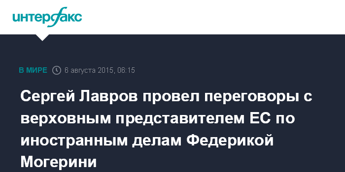 Москва. 6 августа. INTERFAX.RU - Министр иностранных дел России Сергей Лавров обсудил с верховным представителем ЕС по иностранным делам и политике безопасности Федерикой Могерини ситуацию на Украине и в Сирии, сообщил источник в российской делегации.