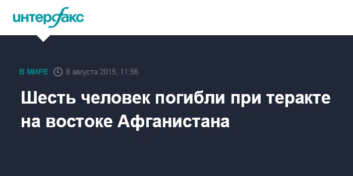 Москва. 6 августа. INTERFAX.RU - Не менее шести человек, среди которых трое мирных жителей, стали жертвами теракта в провинции Логар на востоке Афганистана, сообщает сайт британского издания Daily Telegraph.