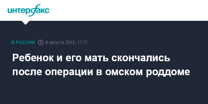 "Днем 1 августа в родильном доме №2 Омска во время операции "кесарево сечение" скончался новорожденный младенец, 37-летняя роженица была переведена в другое медицинское учреждение, где, несмотря на оказанную помощь, скончалась 5 августа", - сказано в сообщении.