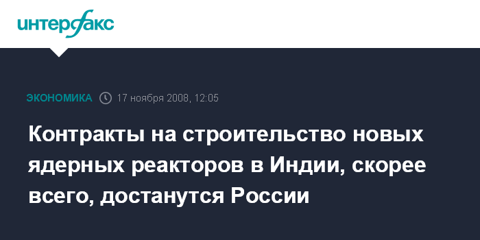 "У России, возможно, лучшие из всех наших партнеров перспективы получить новые выгодные контракты на строительство ядерных реакторов, ведь у России уже есть и специалисты, и материалы в Индии", - сказал он в интервью "Интерфаксу".