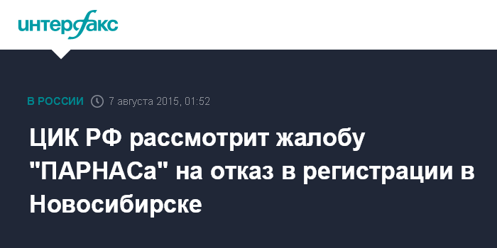 Москва. 7 августа. INTERFAX.RU - ЦИК России рассмотрит в пятницу жалобу "ПАРНАСа" на отказ Новосибирского облизбиркома в регистрации списка партии для участия в выборах в региональный парламент, назначенных на 13 сентября.