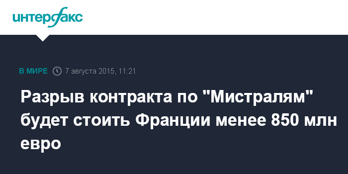 Разрыв контракта по "Мистралям" будет стоить Франции менее 850 млн евро