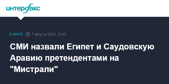 Москва. 7 августа. INTERFAX.RU - Египет и Саудовская Аравия заинтересованы в приобретении двух кораблей типа "Мистраль", которые Франция отказалась поставлять России, пишет в пятницу французская газета Le Monde.
