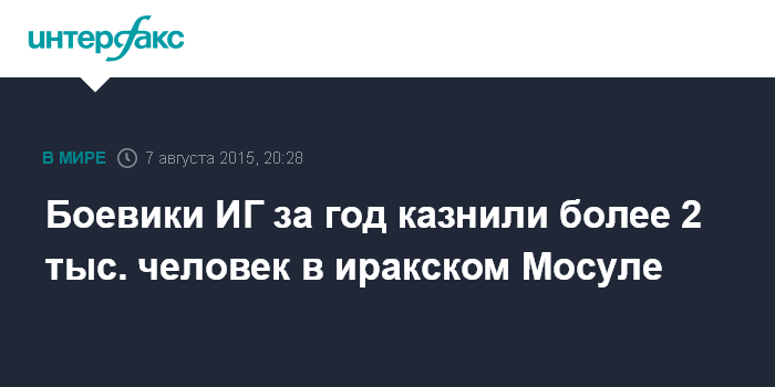 Москва. 7 августа. INTERFAX.RU - Боевики террористической организации ИГ (запрещена в России) убили более 2 тыс. мирных жителей в иракском городе Мосул с момента его захвата в июне 2014 года, сообщают в пятницу западные СМИ со ссылкой на данные иракских властей.