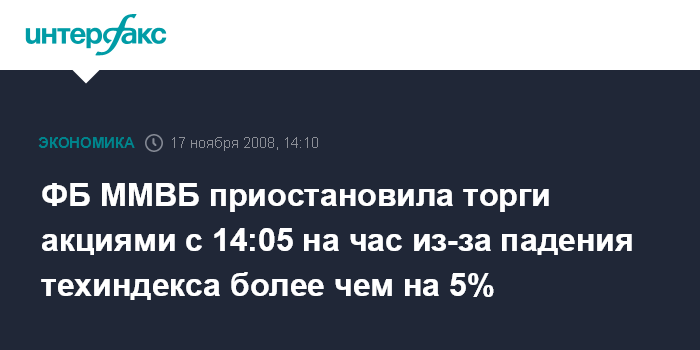 ФБ ММВБ приостановила торги акциями с 14:05 на час из-за падения техиндекса более чем на 5%