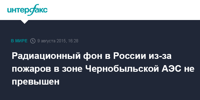 Москва. 9 августа. INTERFAX.RU - В санитарной службе заявили, что в России не зафиксировано превышения радиационного фонда из-за пожаров на Украине в районе Чернобыльской атомной электростанции.