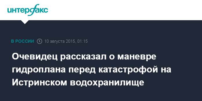 Москва. 10 августа. INTERFAX.RU - Очевидец авиакатастрофы в Истринском районе, которая унесла жизни восьми человек, стал свидетелем выполнения пилотом гидроплана опасного маневра, говорится на сайте телеканала "360 Подмосковье".
