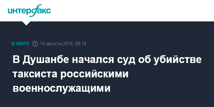 Москва. 10 августа. INTERFAX.RU - Выездная коллегия военного трибунала России приступила к рассмотрению дела об убийстве гражданина Таджикистана, 36-летнего водителя такси Рахимджона Тешабоева, в котором обвиняются двое военнослужащих 201-й российской военной базы (РВБ), дислоцированной в республике.