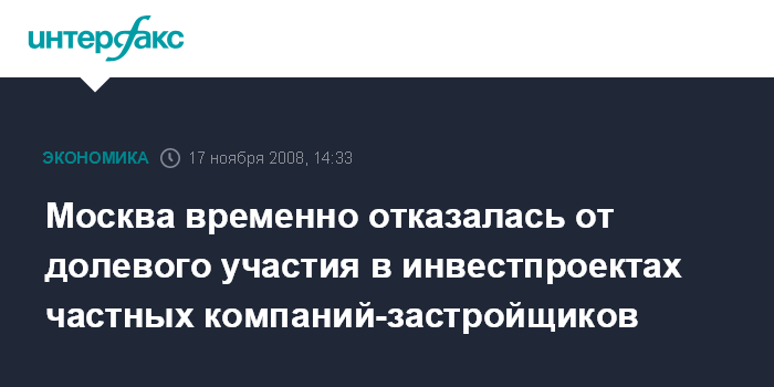 "На днях мэр Москвы Юрий Лужков подписал постановление, отменяющее принятое в июне 2008 года решение о соинвестировании городом проектов, реализуемых частными застройщиками (доля города в них составляла до 30% от общего объема вводимого жилья - ИФ)", - сказал собеседник агентства. Он напомнил, что в 2008 году власти планировали организовать конкурсы для долевого участия Москвы в финансировании строительства порядка 1 млн кв. метров жилья.