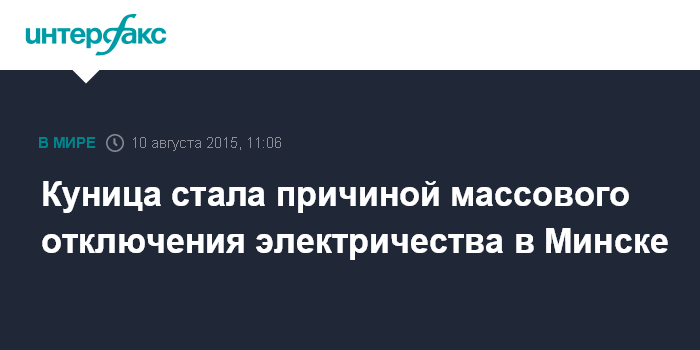 Москва. 10 августа. INTERFAX.RU - Причиной отключения поздним вечером субботы трансформатора на минской подстанции "Зеленый Луг" и последовавшего за этим массового отключения энергопотребителей столицы стало попадание в трансформатор куницы, сообщает пресс-служба ГПО "Белэнерго".