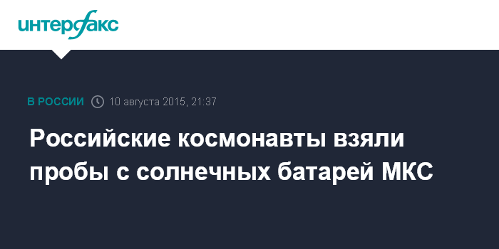 Москва. 10 августа. INTERFAX.RU - Работающие в открытом космосе российские космонавты Геннадий Падалка и Михаил Корниенко взяли пробы загрязнений с солнечных батарей МКС, сообщили "Интерфаксу" в Центре управления полетами.
