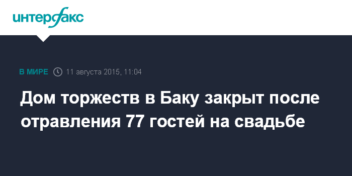 Москва. 11 августа. INTERFAX.RU - Бакинский дом торжеств, в котором на свадьбе отравились около 80 человек, закрыт за несоблюдение норм гигиены, сообщил агентству "Интерфакс" начальник отдела питания Центра гигиены и эпидемиологии Минздрава Азербайджана Имран Абдуллаев.