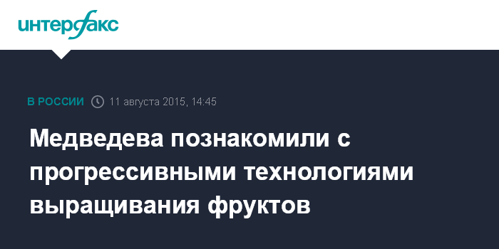 Москва. 11 августа. INTERFAX.RU - Эффективность технологии выращивания фруктов в России по многим показателям выше европейской, рассказали премьер-министру РФ Дмитрию Медведеву в опытно-производственном хозяйстве "Центральное" Северо-Кавказского зонального НИИ садоводства и виноградарства.