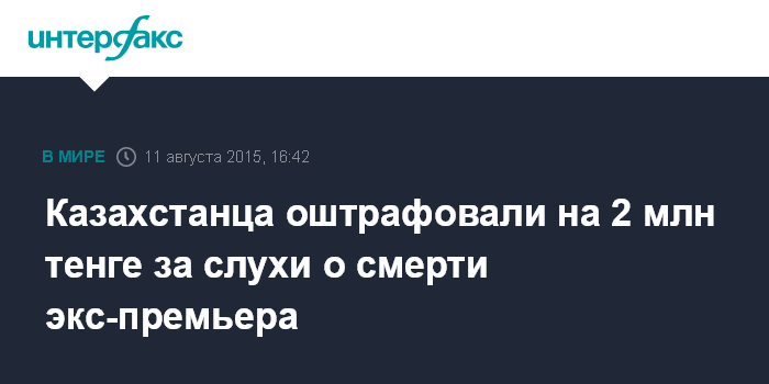 Москва. 11 августа. INTERFAX.RU - Суд района имени Рыскулова Жамбылской области Казахстана оштрафовал гражданина страны за распространение слухов о смерти бывшего премьер-министра Серика Ахметов.