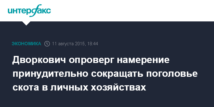 Москва. 11 августа. INTERFAX.RU - Правительство не рассматривает вопрос ни о каком принудительном сокращении поголовья скота в действующих личных подсобных хозяйствах (ЛПХ), заявил журналистам вице-премьер Аркадий Дворкович.