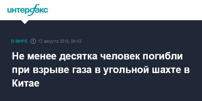 Москва. 12 августа. INTERFAX.RU - По меньшей мере, 10 человек стали жертвами аварии на угольной шахте в юго-западной китайской провинции Гуйчжоу, сообщили местные СМИ.