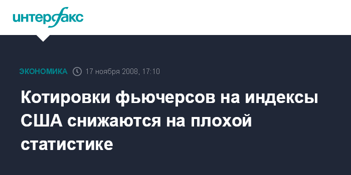 Цена декабрьского фьючерса на индекс Dow Jones Industrial Average к 16:46 МСК снизилась на 75 пунктов (0,9%) по сравнению с предыдущим торговым днем и составляла 8296 пунктов. Котировки фьючерсов на индекс Standard & Poor‘s 500 к этому времени уменьшились на 8,4 пункта (0,98%) - до 853,1 пункта и на Nasdaq-100 - на 7,75 пункта (0,67%), составив 1147,75 пункта.
