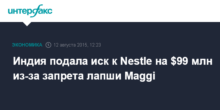 Москва. 12 августа. INTERFAX.RU - Власти Индии хотят взыскать с подразделения швейцарского производителя продуктов питания Nestle в стране 6,4 млрд рупий ($99 млн) в связи с запретом лапши под брендом Maggi, сообщает агентство Bloomberg.