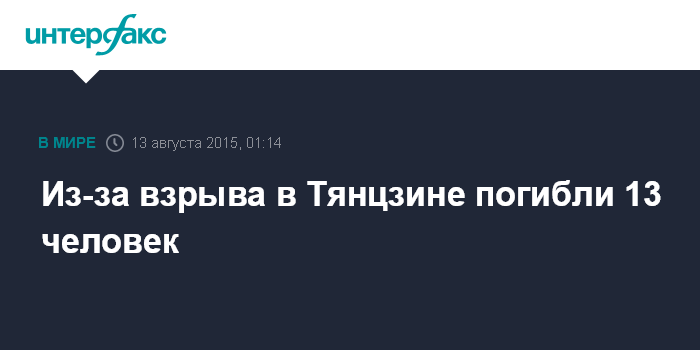 Москва. 13 августа. INTERFAX.RU - Жертвами мощного взрыва в китайском городе Тянцзине стали 13 человек, сотни пострадали, сообщил в четверг телеканал CCTV.