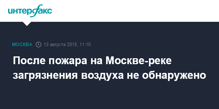 Москва. 13 августа. INTERFAX.RU - По данным станций Мосэкомониторинга, расположенных в районе произошедшего в среду вечером пожара на Москве-реке, концентрации оксида углерода и диоксида азота в вечерние часы не превысили установленных нормативов, сообщили "Интерфаксу" в пресс-службе департамента природопользования и охраны окружающей среды столицы в четверг.