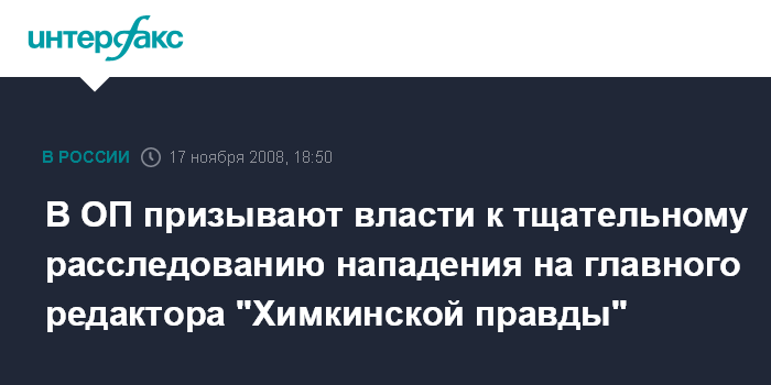 Москва. 17 ноября. INTERFAX.RU - Члены комиссии Общественной палаты по коммуникациям, информационной политике и свободе слова в СМИ призвали власти с особым вниманием отнестись к расследованию уголовного дела об избиении главного редактора "Химкинской правды" Михаила Бекетова.