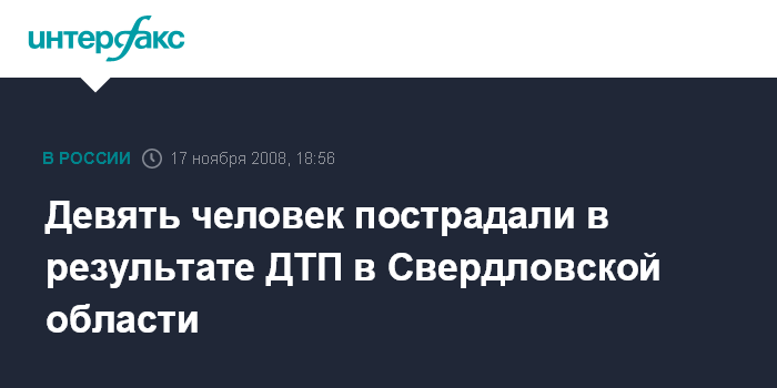 Москва. 17 ноября. INTERFAX.RU - В Свердловской области в районе 318-го км автотрассы Пермь-Екатеринбург в понедельник вечером в результате столкновения трех машин пострадали девять человек.