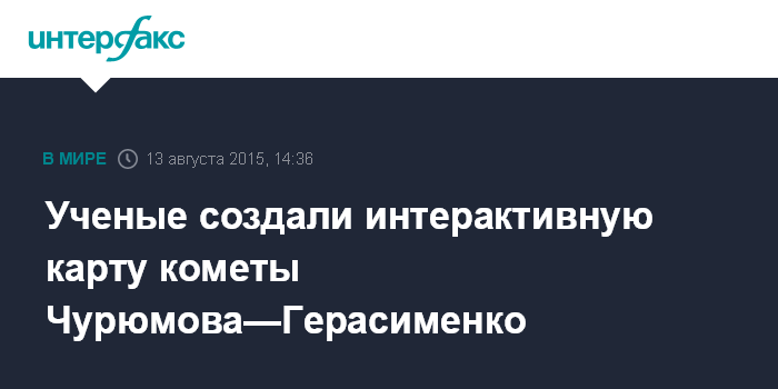 Москва. 13 августа. INTERFAX.RU - Европейское космическое агентство выпустило интерактивную карту комету Чурюмова—Герасименко, сайт проекта позволяет увидеть в деталях трехмерную модель небесного тела, а также узнать расположение отдельных регионов на ее поверхности, сообщает издание N+1.